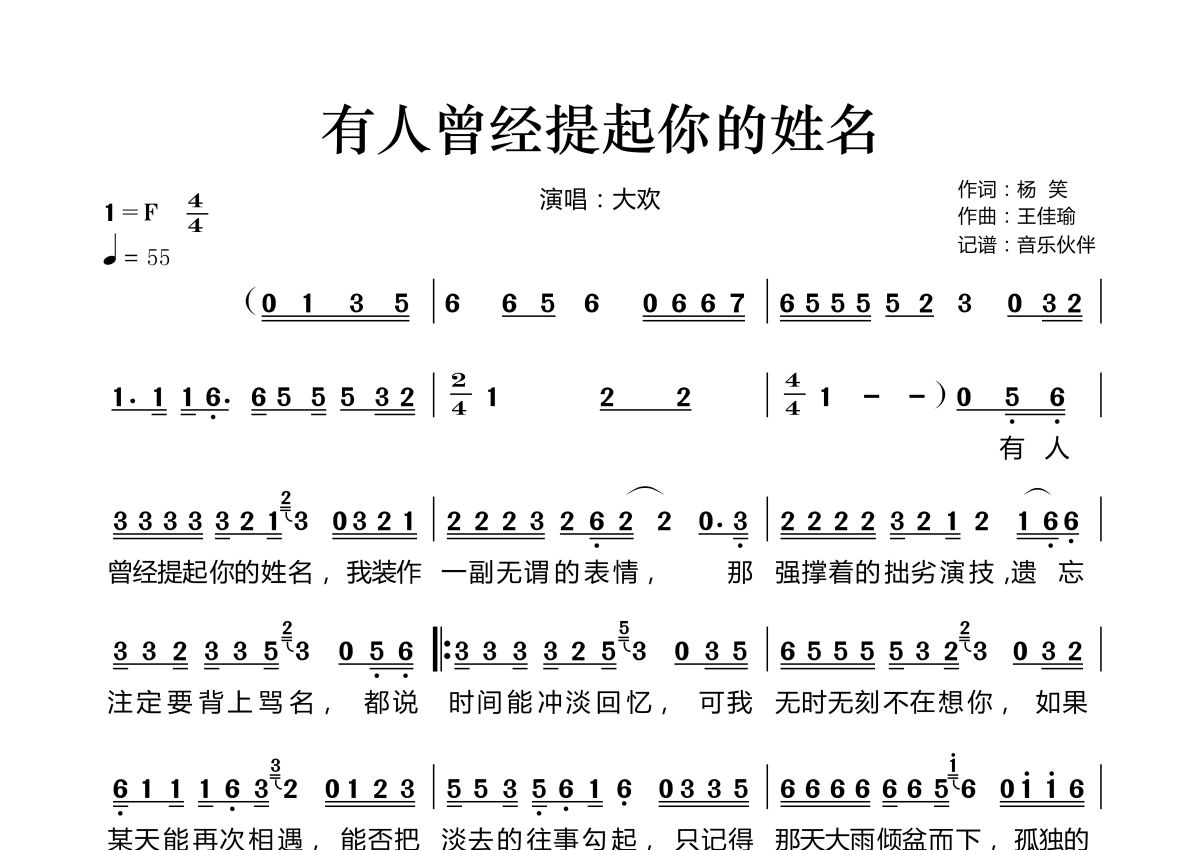 《有人曾经提起你的姓名》是大欢演唱的一首歌曲,拍号为4/4拍,歌曲速度为每分钟55拍,这份简谱共有两张高清图谱,图谱由 @音乐伙伴 编配上传。