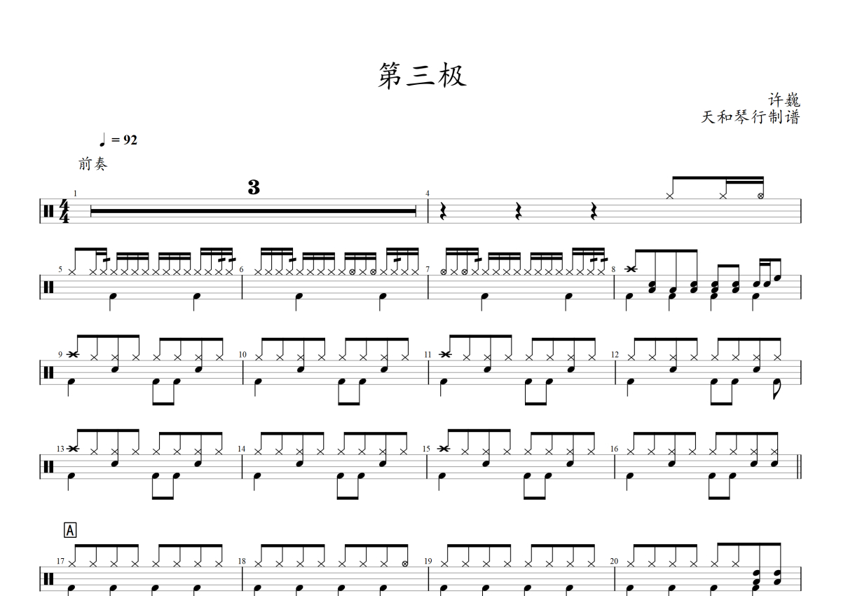 《第三极》是许巍演唱的一首歌曲,拍号为4/4拍,歌曲速度为每分钟92拍,这份架子鼓谱共有两张高清图谱,图谱由 @音符喷血者 编配上传,图谱使用五线谱编配,使用这份第三极架子鼓谱,你将能够轻松地敲打出这首许巍的第三极,快来尝试吧。