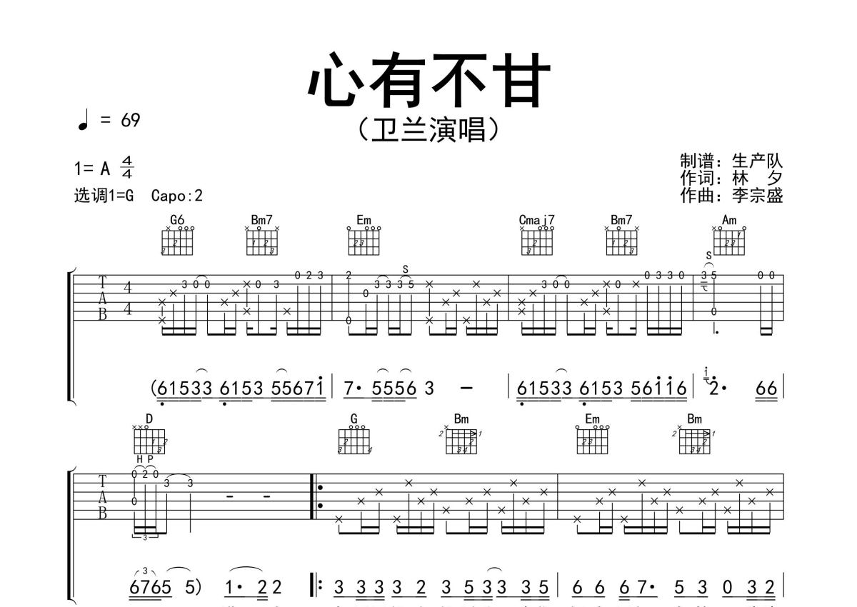 《心有不甘》是卫兰演唱的一首歌曲,精编完美版,拍号为4/4拍,歌曲速度为每分钟69拍,歌曲原调为A调,但由于原调指法比较难,为了方便弹奏,本吉他谱采用的是G调指法编配,变调夹2品弹奏即为原调,当然也可以根据自己的音域改变变调夹位置,或者通过改变和弦调性,以方便自己弹奏,这份吉他谱共有三张高清图谱,图谱由 @生产队 编配上传,图谱使用六线谱编配,包含吉他和弦指法、简谱以及歌词部分,使用这份心有不甘吉他谱,可以让你更加方便地掌握这首歌曲的弹唱技巧,快来尝试吧。卫兰演唱的歌曲《心有不甘》原版吉他谱,完整的前奏、间奏、尾奏编配,精编完美版,怀旧经典。