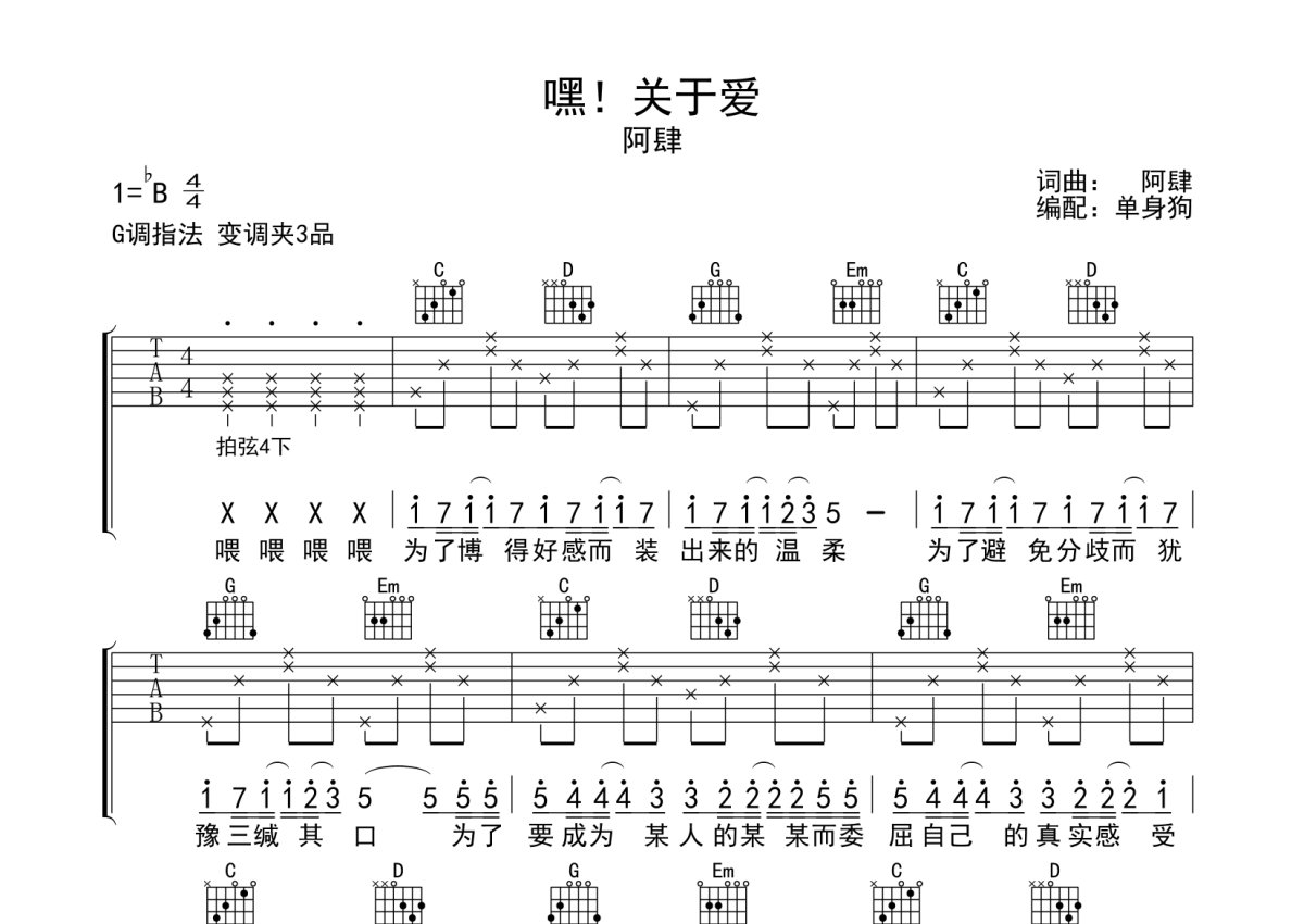 《嘿!关于爱》是阿肆演唱的一首歌曲,本吉他谱采用的是G调指法编配,这份吉他谱共有三张高清图谱,图谱由 @单身狗 编配上传,图谱使用六线谱编配,包含吉他和弦指法、简谱以及歌词部分,使用这份嘿!关于爱吉他谱,可以让你更加方便地掌握这首歌曲的弹唱技巧,快来尝试吧。阿肆《嘿!关于爱》吉他弹唱谱,采用G调指法编配,单身狗编配出品,共有3张高清图谱。