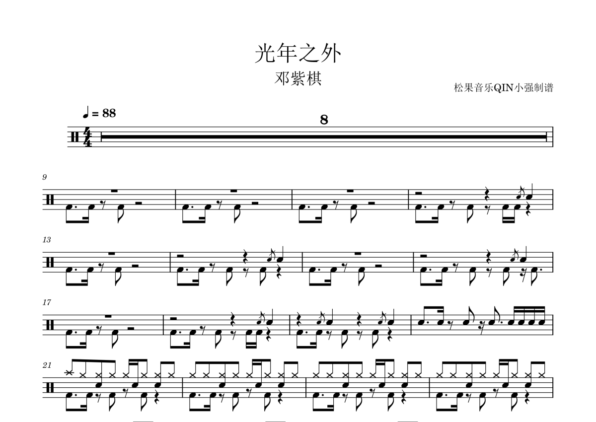 《光年之外》是邓紫棋演唱的一首歌曲,拍号为4/4拍,这份架子鼓谱共有两张高清图谱,图谱由 @松果音乐QIN小强 编配上传,图谱使用五线谱编配,使用这份光年之外架子鼓谱,你将能够轻松地敲打出这首邓紫棋的光年之外,快来尝试吧。《光年之外》是由邓紫棋创作词曲并演唱的流行歌曲,于2016年12月30日以单曲形式发行 该曲是电影《太空旅客》片方特地邀请邓紫棋为其打造的中国区主题曲,邓紫棋在看过电影数个片段后,被两位主角的爱情所触动,因此灵思泉涌,在写下了多个歌曲的备选版本后,创作出了《光年之外》,以缠绵歌词搭配动人旋律,将电影中的爱恋演绎得大气磅礴。
