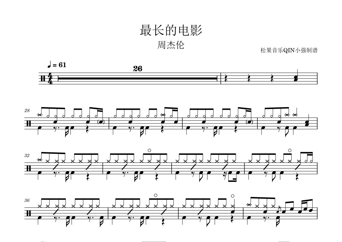 《最长的电影》是周杰伦演唱的一首歌曲,拍号为4/4拍,这份架子鼓谱共有一张高清图谱,图谱由 @松果音乐QIN小强 编配上传,图谱使用五线谱编配,使用这份最长的电影架子鼓谱,你将能够轻松地敲打出这首周杰伦的最长的电影,快来尝试吧。《最长的电影》是周杰伦演唱的一首歌曲,由周杰伦作词、作曲,钟兴民编曲,收录在周杰伦2007年11月2日发行的专辑《我很忙》中。