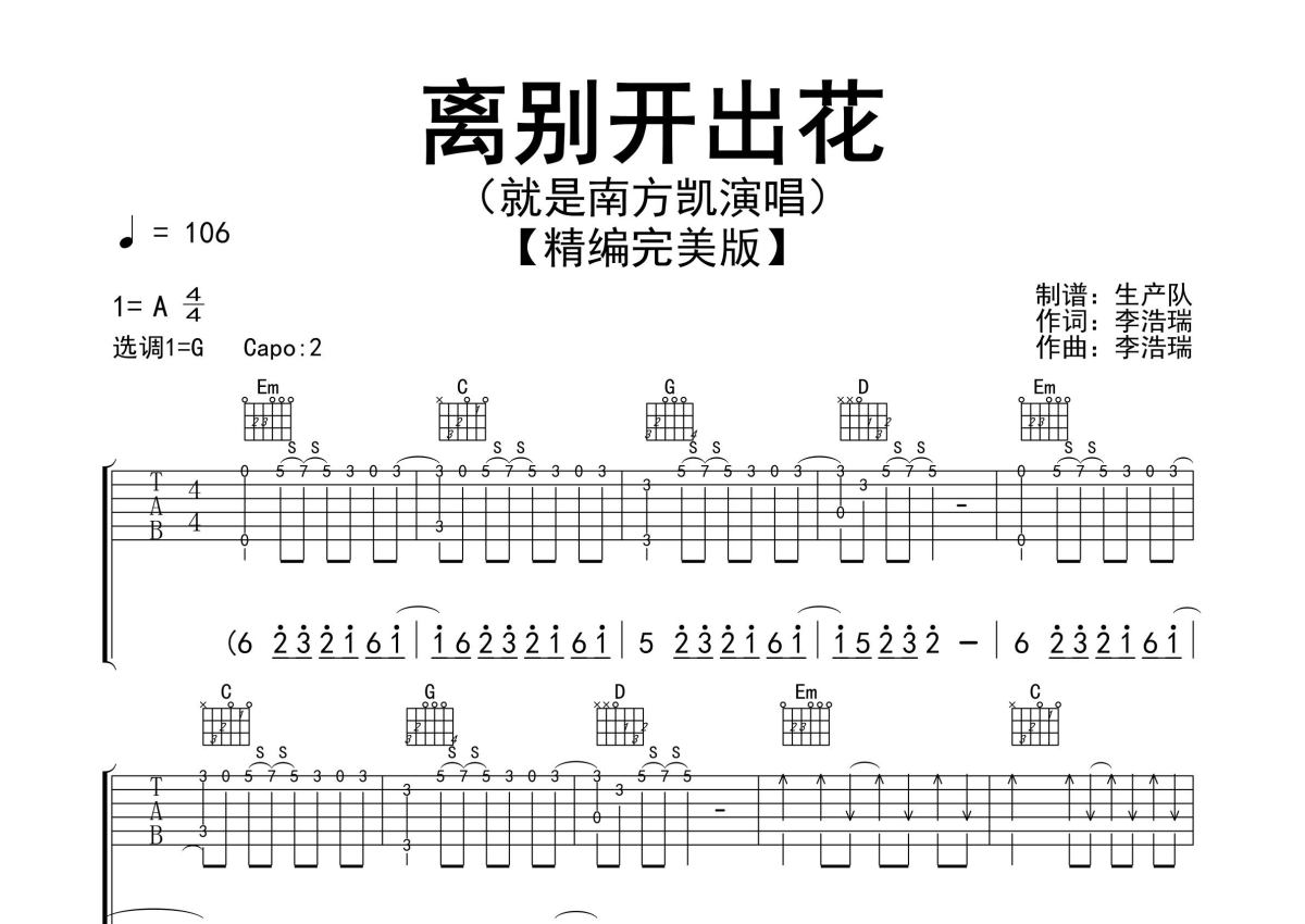 《离别开出花》是就是南方凯演唱的一首歌曲,精编完美版,拍号为4/4拍,歌曲速度为每分钟106拍,歌曲原调为A调,但由于原调指法比较难,为了方便弹奏,本吉他谱采用的是G调指法编配,变调夹2品弹奏即为原调,当然也可以根据自己的音域改变变调夹位置,或者通过改变和弦调性,以方便自己弹奏,这份吉他谱共有三张高清图谱,图谱由 @生产队 编配上传,图谱使用六线谱编配,包含吉他和弦指法、简谱以及歌词部分,使用这份离别开出花吉他谱,可以让你更加方便地掌握这首歌曲的弹唱技巧,快来尝试吧。就是南方凯演唱的经典歌曲《离别开出花》原版吉他谱,精准的前奏、间奏solo编配,精编完美版,怀旧经典!。