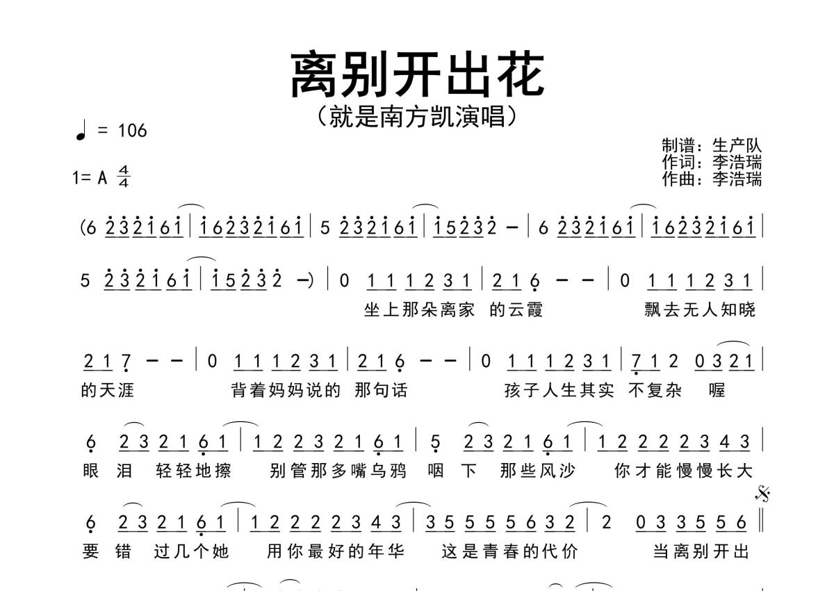 《离别开出花》是就是南方凯演唱的一首歌曲,原版简谱,拍号为4/4拍,歌曲速度为每分钟106拍,这份简谱共有一张高清图谱,图谱由 @生产队 编配上传就是南方凯演唱的经典歌曲《离别开出花》原版简谱,精准的前奏、间奏solo编配。