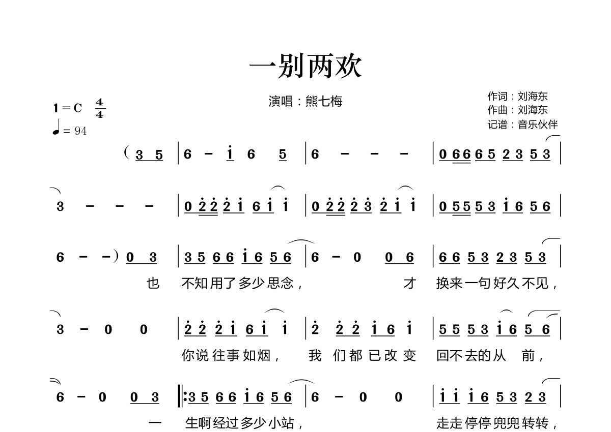 《一别两欢》是熊七梅演唱的一首歌曲,拍号为4/4拍,歌曲速度为每分钟94拍,这份简谱共有两张高清图谱,图谱由 @音乐伙伴 编配上传。