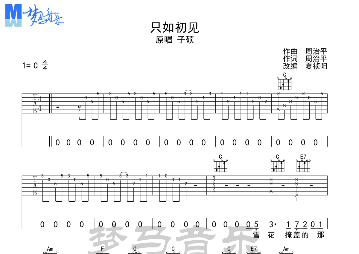 子硕《只如初见》吉他谱 - C调弹唱六线谱