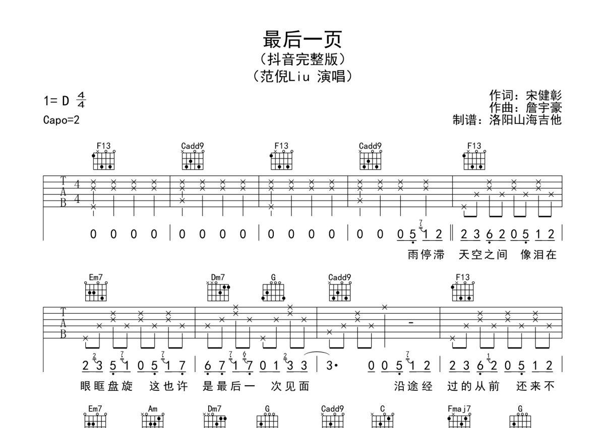 范倪Liu《最后一页》吉他谱 - C调弹唱六线谱