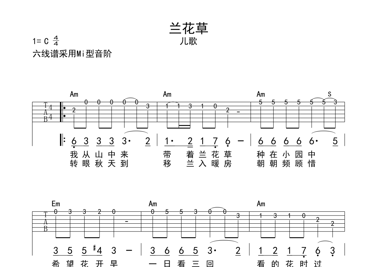 兰花草吉他谱 - 儿歌演唱 - C调独奏solo六线谱