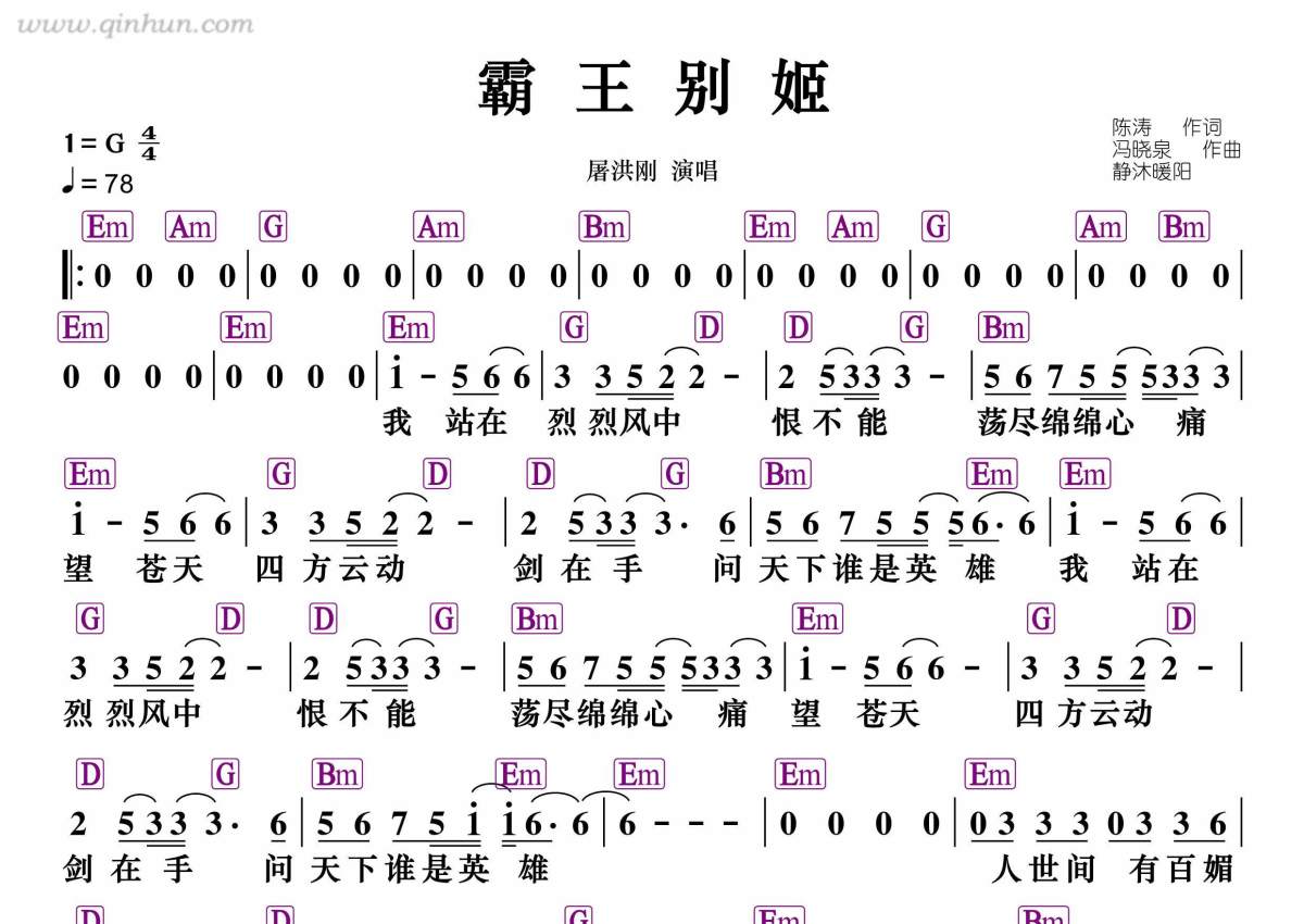 《霸王别姬》是屠洪刚演唱的一首歌曲,和弦谱,拍号为4/4拍,歌曲速度为每分钟78拍,这份简谱共有一张高清图谱,图谱由 @静沐暖阳 编配上传。