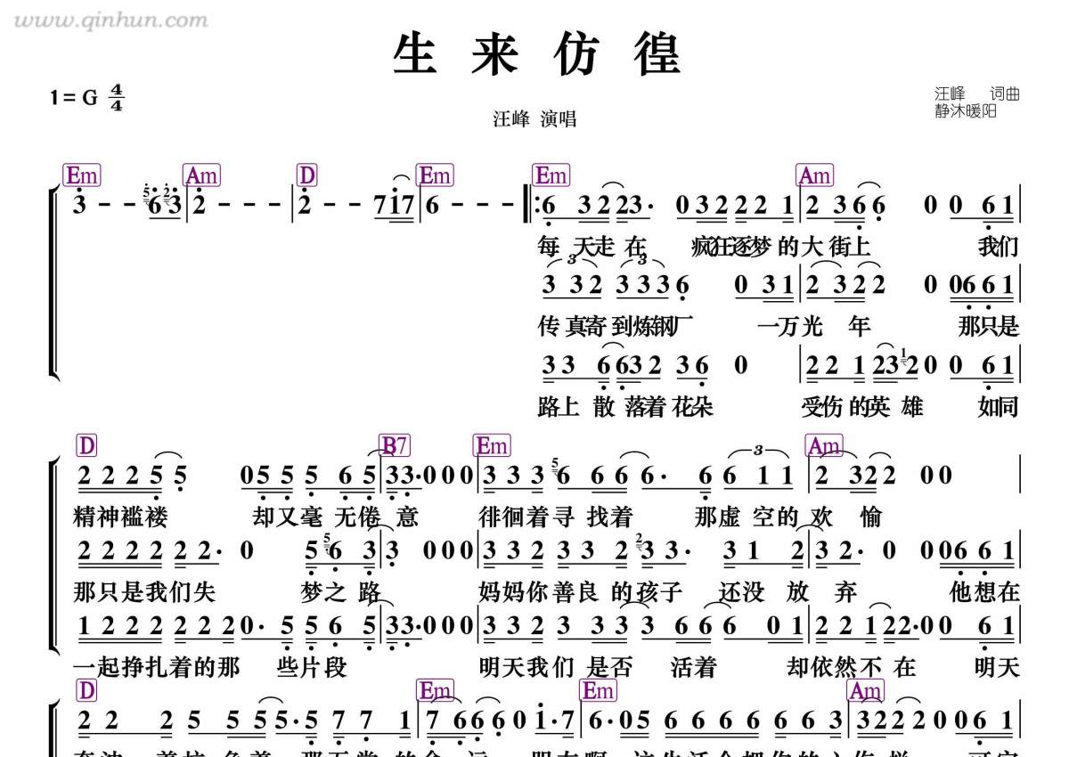 《生来仿徨》是汪峰演唱的一首歌曲,和弦谱,拍号为4/4拍,这份简谱共有一张高清图谱,图谱由 @静沐暖阳 编配上传。