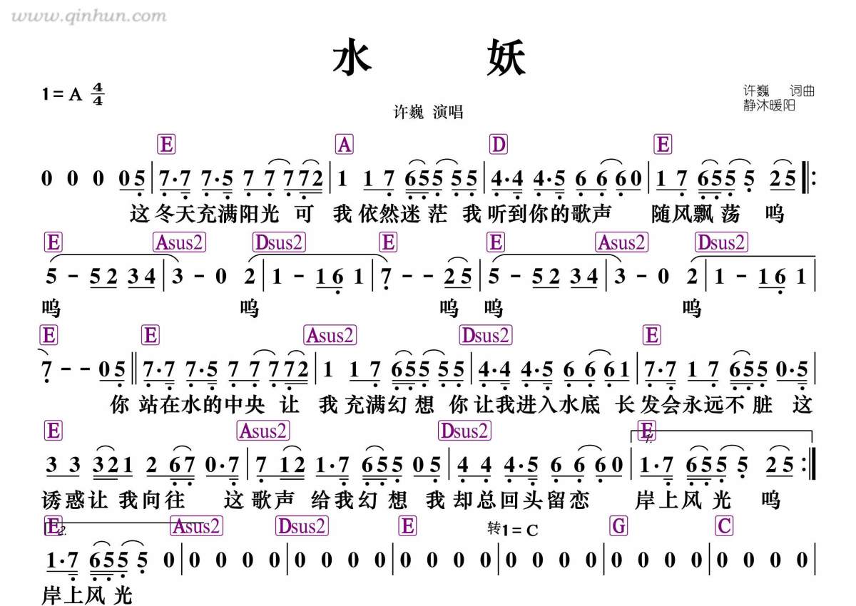 《水妖》是许巍演唱的一首歌曲,和弦谱,拍号为4/4拍,这份简谱共有一张高清图谱,图谱由 @静沐暖阳 编配上传。