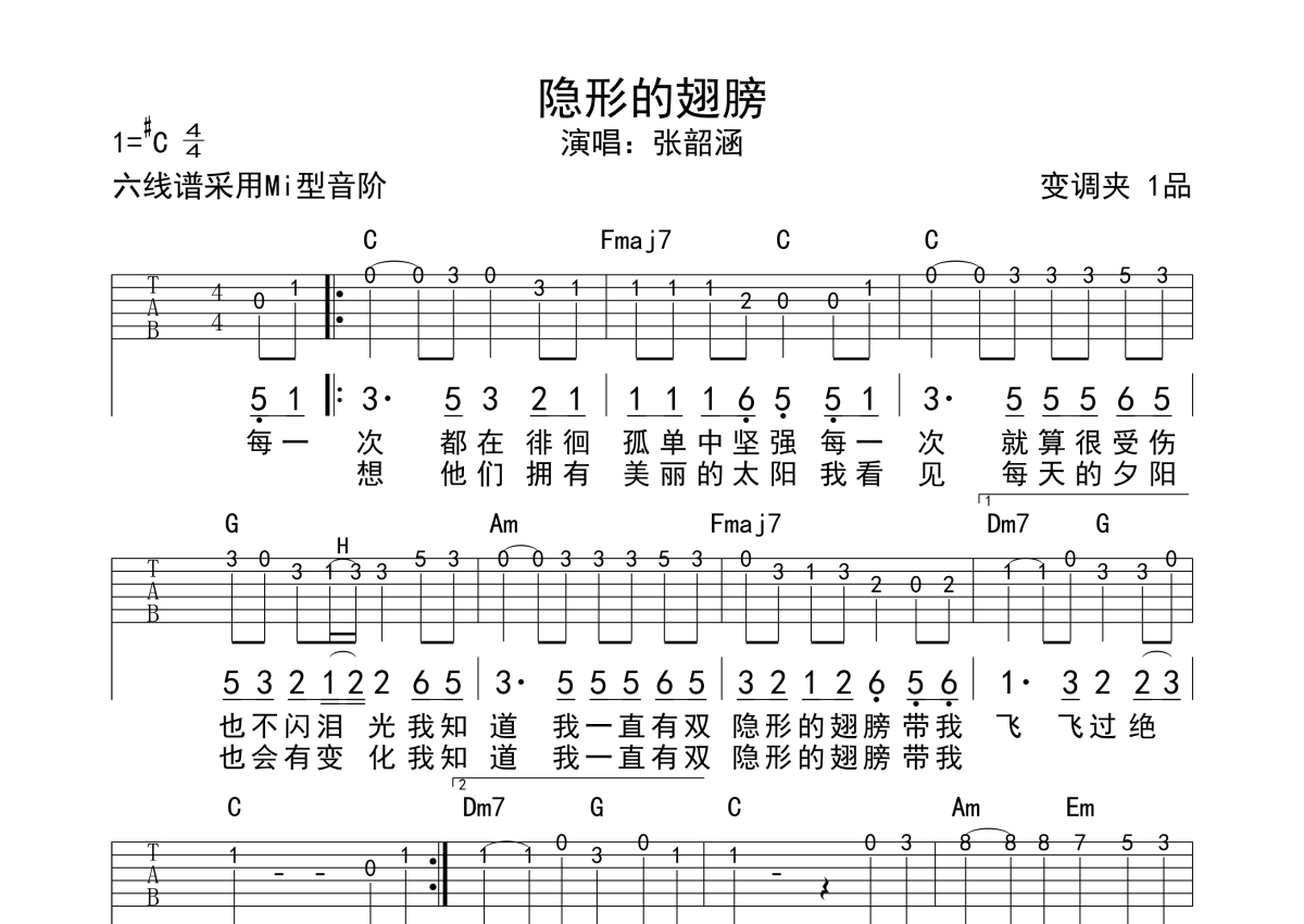 《隐形的翅膀》是张韶涵演唱的一首歌曲,拍号为4/4拍,歌曲原调为Db调,但由于原调指法比较难,为了方便弹奏,本吉他谱采用的是C调指法编配,变调夹1品弹奏即为原调,当然也可以根据自己的音域改变变调夹位置,或者通过改变和弦调性,以方便自己弹奏,这份吉他谱共有一张高清图谱,图谱由 @觅火单音谱 编配上传,图谱使用六线谱编配,使用这份隐形的翅膀吉他谱,可以让你更加方便地掌握这首歌曲的演奏技巧,快来尝试吧。