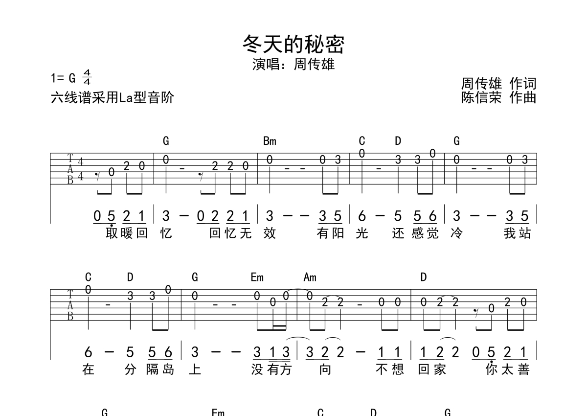 周传雄《冬天的秘密》吉他谱 - G调独奏solo六线谱