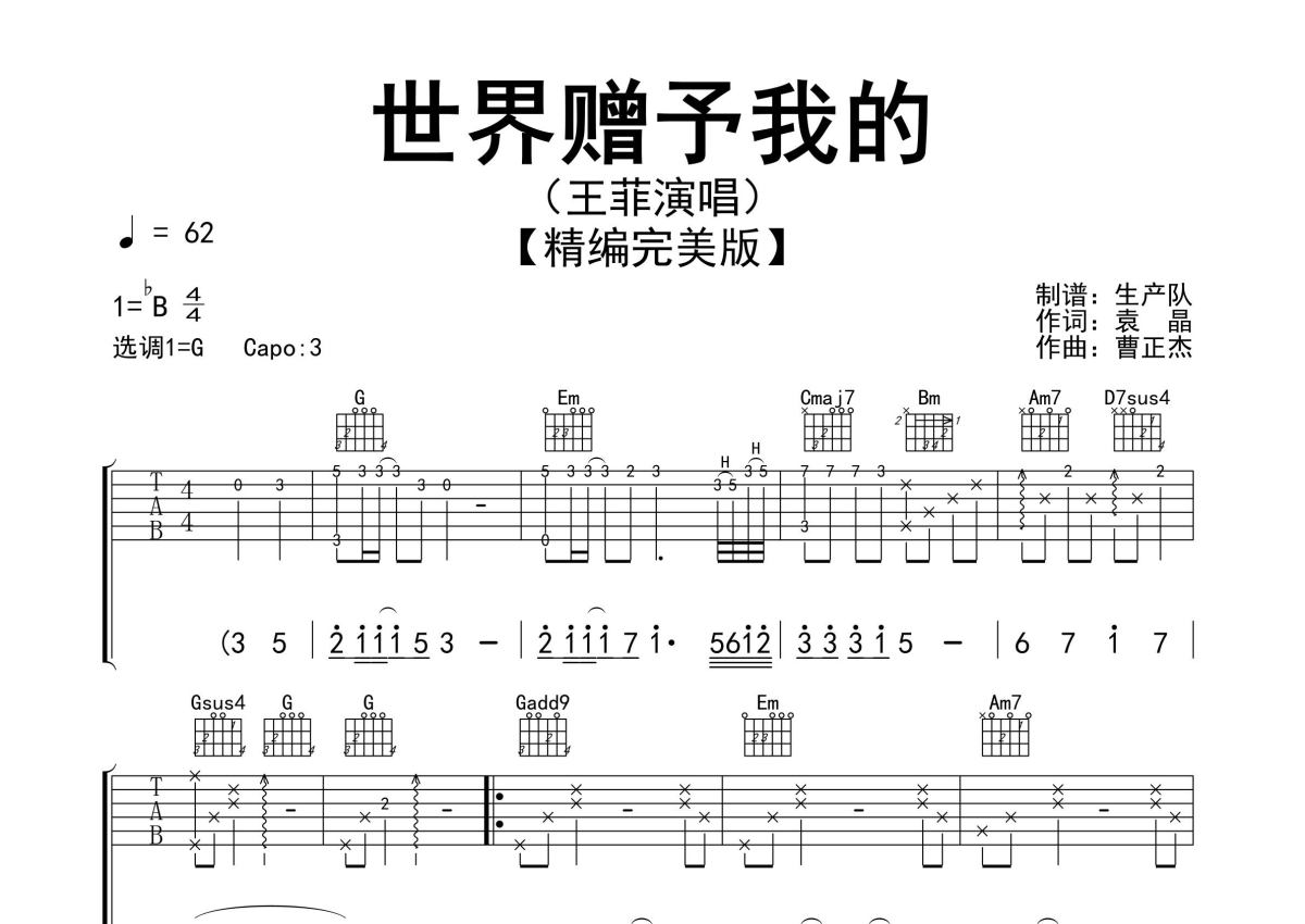 《世界赠予我的》是王菲演唱的一首歌曲,精编完美版,拍号为4/4拍,歌曲速度为每分钟62拍,歌曲原调为Bb调,但由于原调指法比较难,为了方便弹奏,本吉他谱采用的是G调指法编配,变调夹3品弹奏即为原调,当然也可以根据自己的音域改变变调夹位置,或者通过改变和弦调性,以方便自己弹奏,这份吉他谱共有三张高清图谱,图谱由 @生产队 编配上传,图谱使用六线谱编配,包含吉他和弦指法、简谱以及歌词部分,使用这份世界赠予我的吉他谱,可以让你更加方便地掌握这首歌曲的弹唱技巧,快来尝试吧。王菲演唱的歌曲《世界赠予我的》原版吉他谱,完整的前奏、间奏、尾奏solo编配,精编完美版,值得推荐!。
