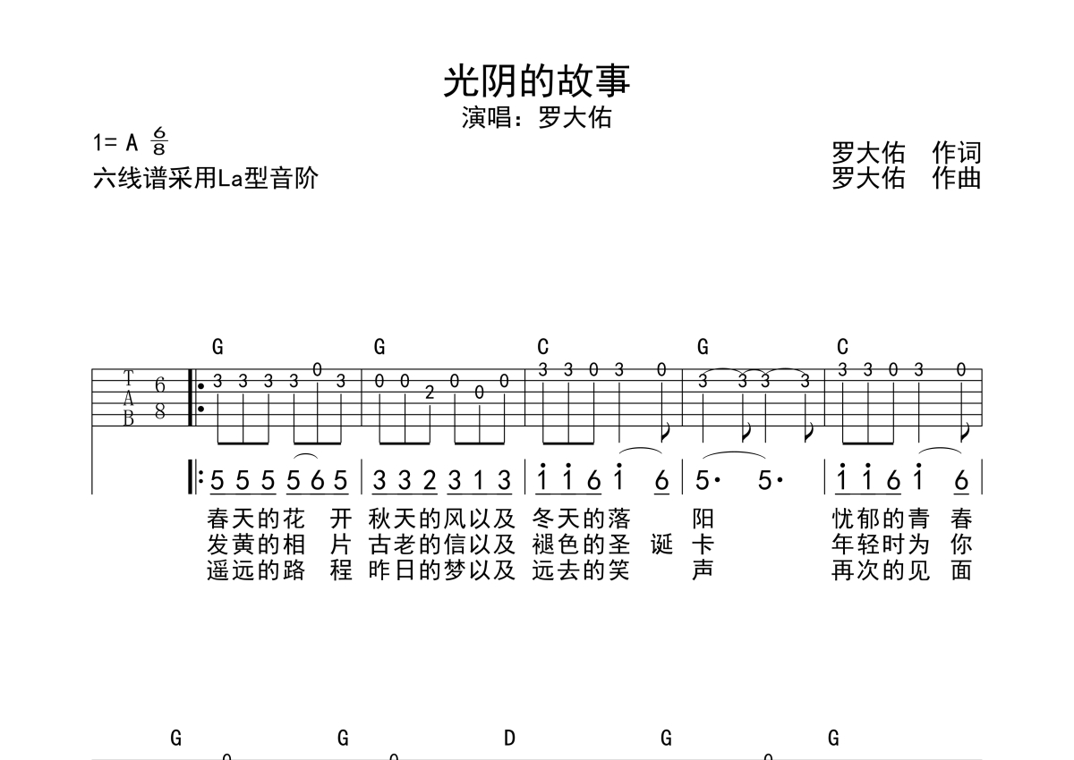 光阴的故事吉他谱 - 罗大佑演唱 - G调独奏solo六线谱