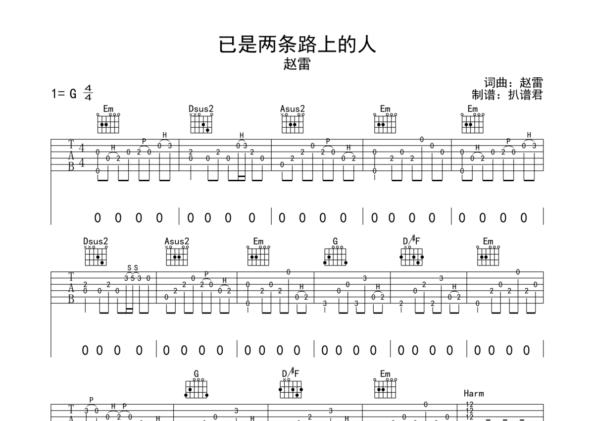 已是两条路上的人吉他谱 - 赵雷演唱 - G调弹唱六线谱