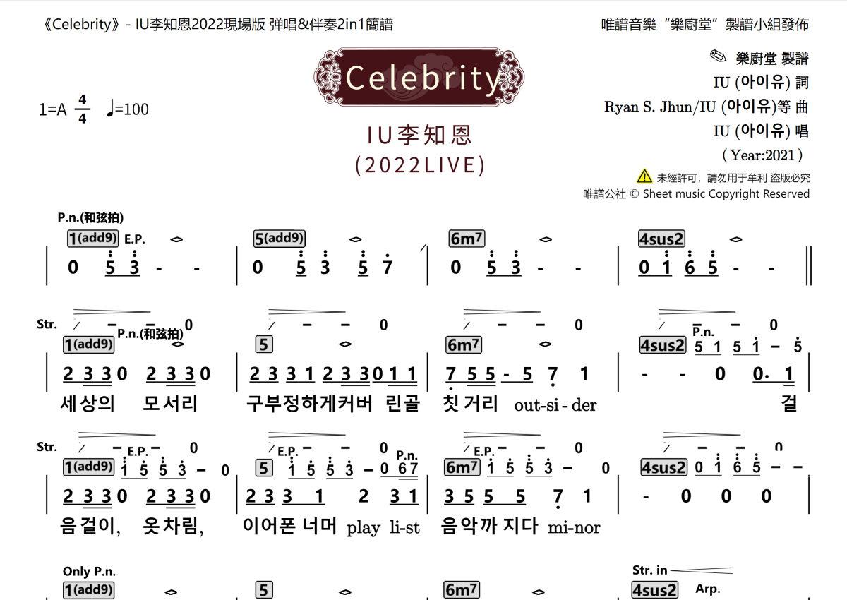 《Celebrity(Live)》是IU李知恩演唱的一首歌曲,这份乐队总谱共有三张高清图谱,图谱由 @唯谱音乐"乐厨堂"发布小组 编配上传。