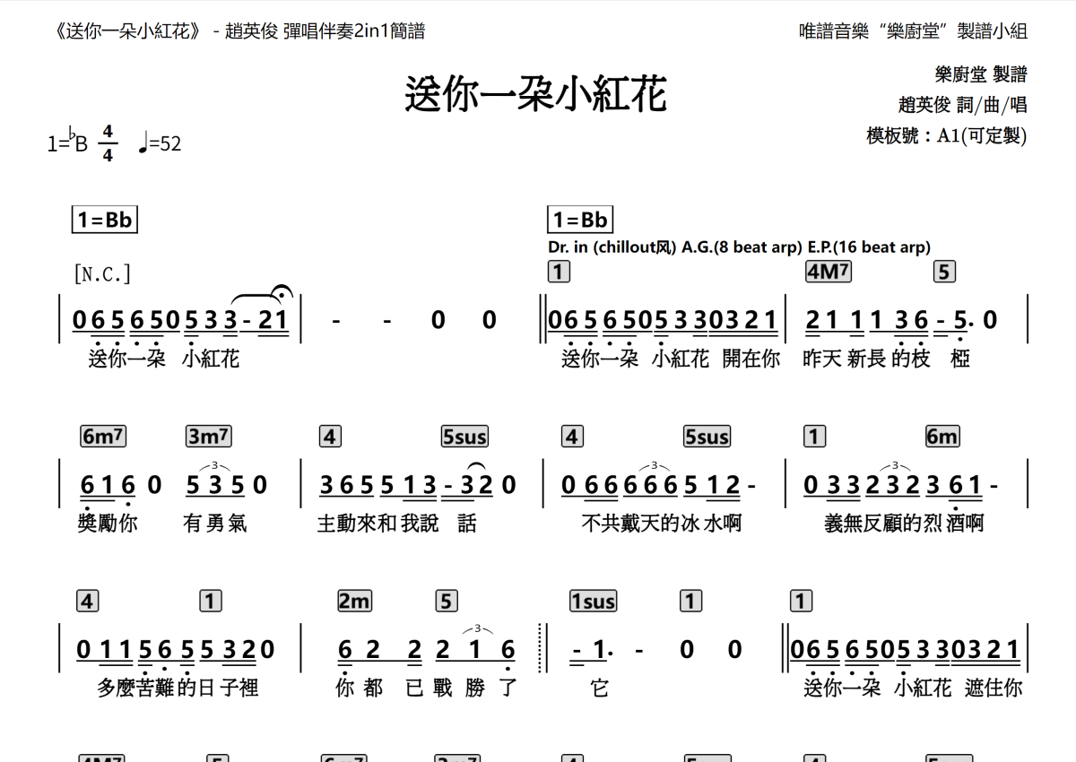“乐厨堂”乐谱发布小组: 出版级乐谱扒谱制谱——以职业乐手圈通行标准记谱,遵循原版和声、伴奏元素和段落结构。 ❶ 2.0多功能专业团谱:采用台湾卓著公司开创的二代简谱标准制作。二代简谱无疑是迄今为止最科学、最易读的专业范畴多功能记谱方案:❷ 框架谱:采用职业乐手通常记谱方案制作。