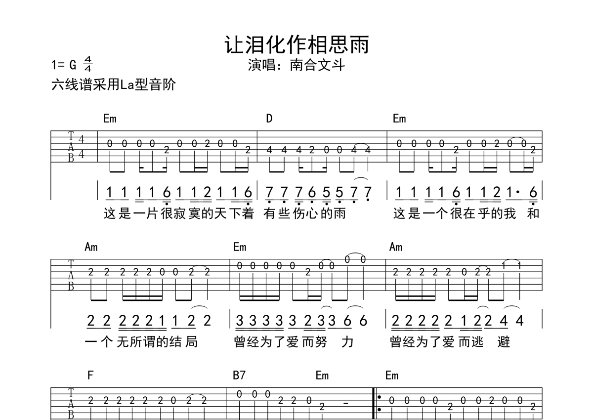 南合文斗《让泪化作相思雨》吉他谱 - C调独奏solo六线谱