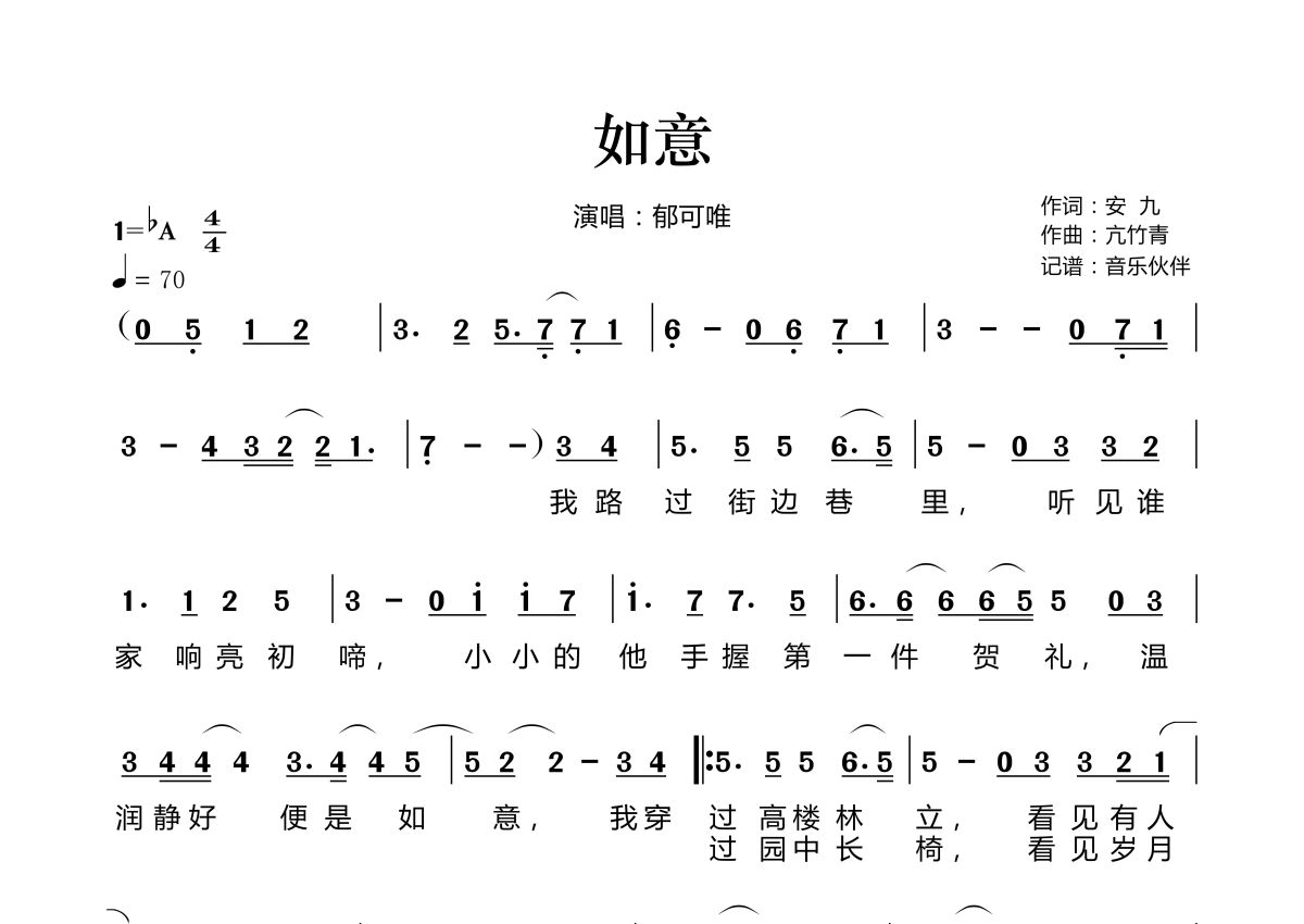 《如意》是郁可唯演唱的一首歌曲,拍号为4/4拍,歌曲速度为每分钟70拍,这份简谱共有两张高清图谱,图谱由 @音乐伙伴 编配上传。