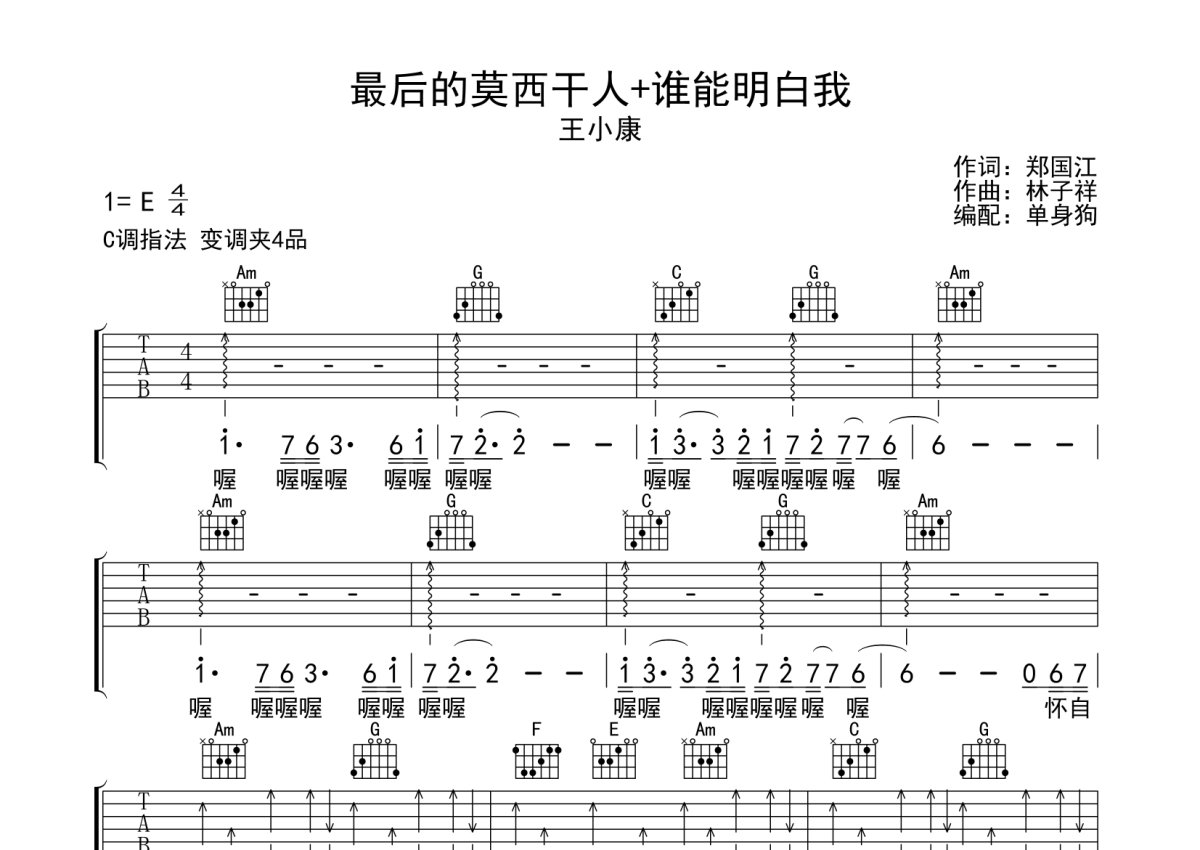 《最后的莫西干人+谁能明白我》是王小康演唱的一首歌曲,本吉他谱采用的是C调指法编配,这份吉他谱共有两张高清图谱,图谱由 @单身狗 编配上传,图谱使用六线谱编配,包含吉他和弦指法、简谱以及歌词部分,使用这份最后的莫西干人+谁能明白我吉他谱,可以让你更加方便地掌握这首歌曲的弹唱技巧,快来尝试吧。王小康《最后的莫西干人+谁能明白我》吉他弹唱谱,采用C调指法编配,单身狗编配出品,共有2张高清图谱,免翻页排版设计。