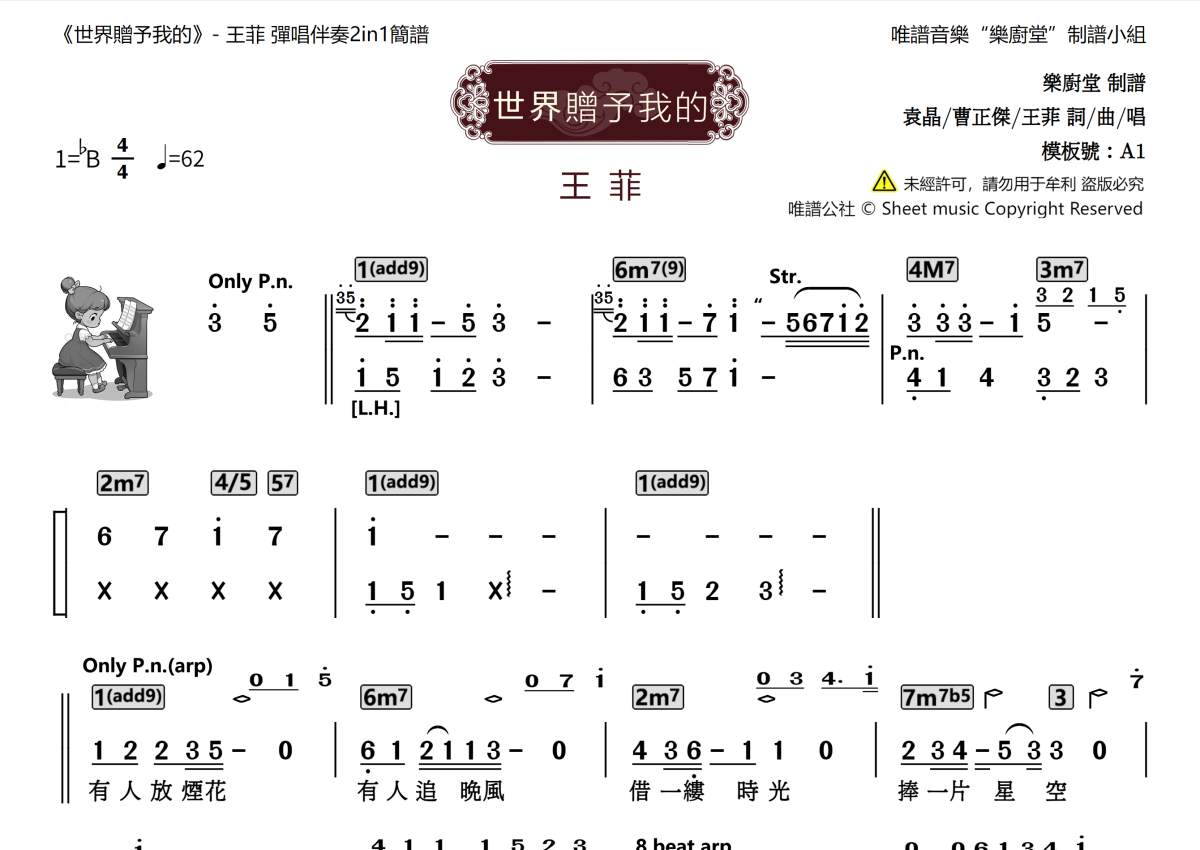 “乐厨堂”乐谱发布小组: 出版级乐谱扒谱制谱——以职业乐手圈通行标准记谱,遵循原版和声、伴奏元素和段落结构。 ❶ 2.0多功能专业团谱:采用台湾卓著公司开创的二代简谱标准制作。二代简谱无疑是迄今为止最科学、最易读的专业范畴多功能记谱方案:❷ 框架谱:采用职业乐手通常记谱方案制作。