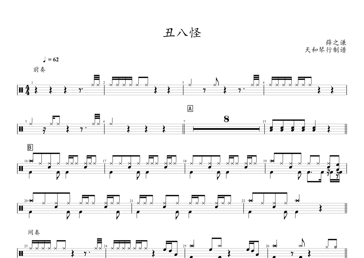 《丑八怪》是薛之谦演唱的一首歌曲,拍号为4/4拍,歌曲速度为每分钟62拍,这份架子鼓谱共有两张高清图谱,图谱由 @音符喷血者 编配上传,图谱使用五线谱编配,使用这份丑八怪架子鼓谱,你将能够轻松地敲打出这首薛之谦的丑八怪,快来尝试吧。