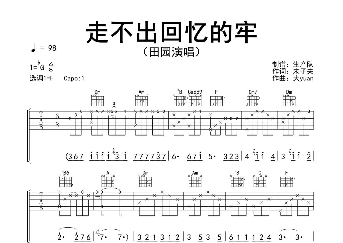 《走不出回忆的牢》是田园演唱的一首歌曲,精编完美版,拍号为6/8拍,歌曲速度为每分钟98拍,歌曲原调为Gb调,但由于原调指法比较难,为了方便弹奏,本吉他谱采用的是F调指法编配,变调夹1品弹奏即为原调,当然也可以根据自己的音域改变变调夹位置,或者通过改变和弦调性,以方便自己弹奏,这份吉他谱共有三张高清图谱,图谱由 @生产队 编配上传,图谱使用六线谱编配,包含吉他和弦指法、简谱以及歌词部分,使用这份走不出回忆的牢吉他谱,可以让你更加方便地掌握这首歌曲的弹唱技巧,快来尝试吧。田园演唱的歌曲《走不出回忆的牢》原版吉他谱,完整的前奏、间奏、尾奏solo编配,精编完美版,值得推荐!。