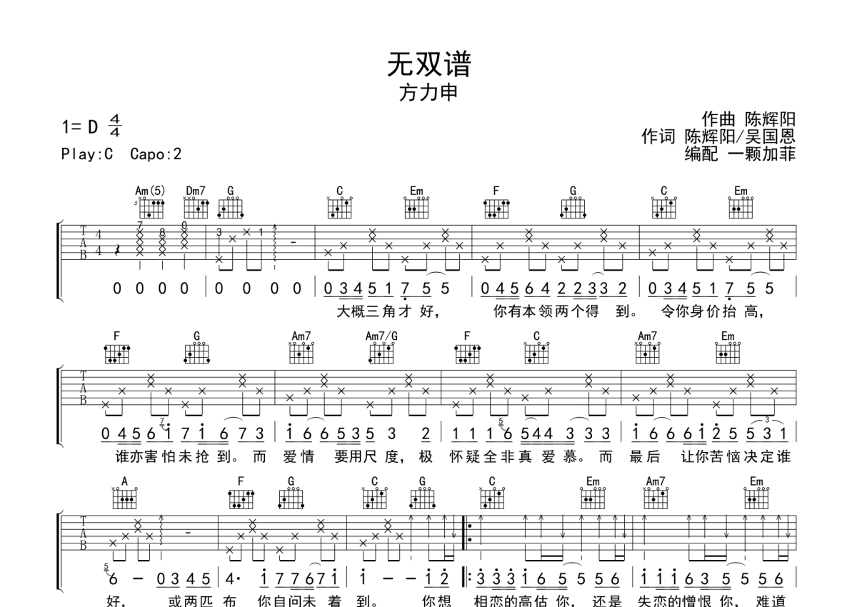 方力申《无双谱》吉他谱 - C调弹唱六线谱