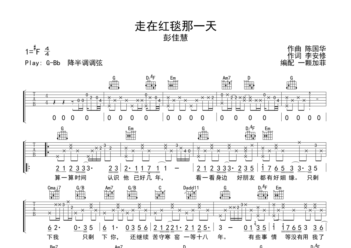 彭佳慧《走在红毯那一天》吉他谱 - G调弹唱六线谱