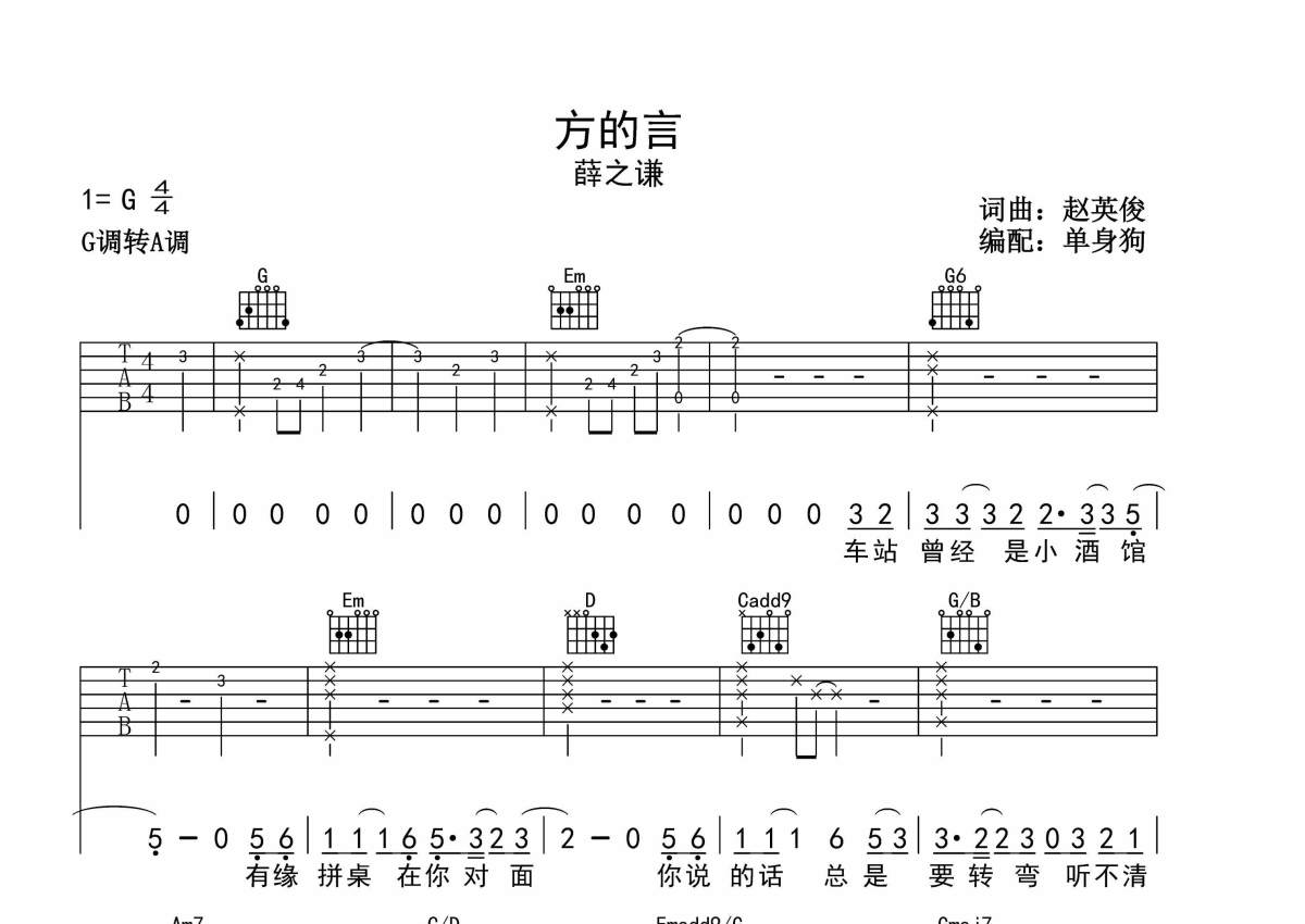 方的言吉他谱 - 薛之谦演唱 - G调弹唱六线谱