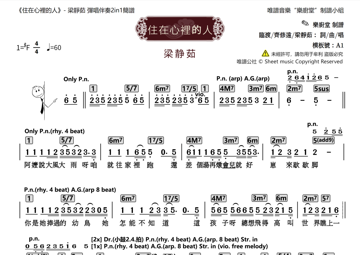 《住在心里的人》是梁静茹演唱的一首歌曲,这份乐队总谱共有两张高清图谱,图谱由 @唯谱音乐"乐厨堂"发布小组 编配上传。