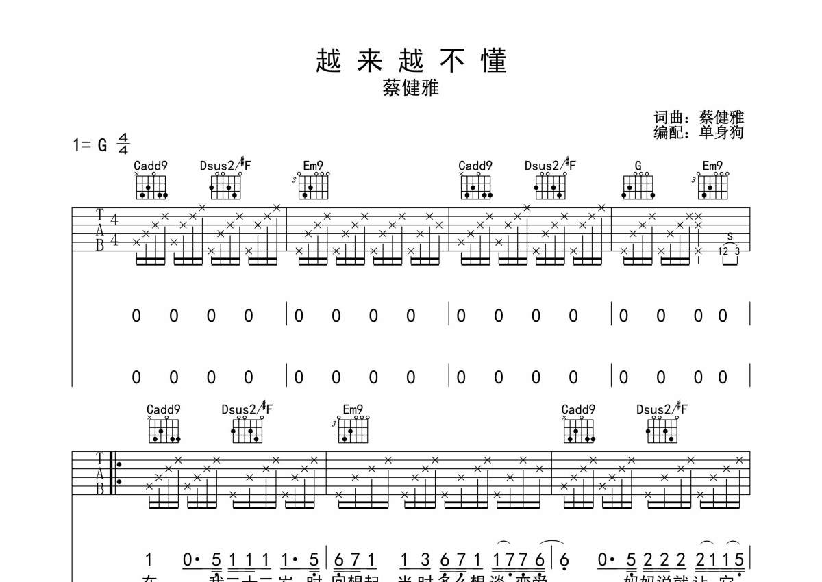 《越来越不懂》是蔡健雅演唱的一首歌曲,拍号为4/4拍,歌曲原调为G调,本吉他谱采用的是G调指法编配,演奏时不需要使用变调夹即为原调,这份吉他谱共有四张高清图谱,图谱由 @单身狗 编配上传,图谱使用六线谱编配,包含吉他和弦指法、简谱以及歌词部分,使用这份越来越不懂吉他谱,可以让你更加方便地掌握这首歌曲的弹唱技巧,快来尝试吧。
