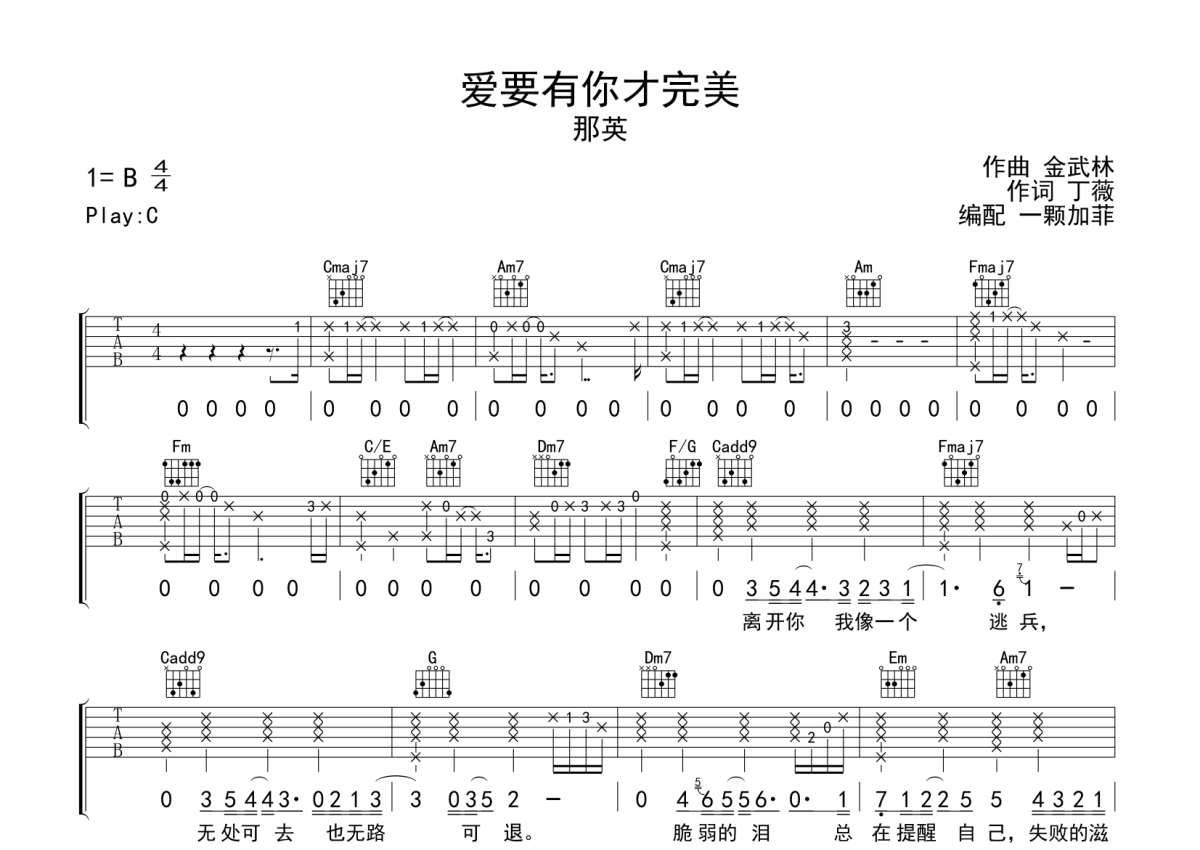 《爱要有你才完美》是那英演唱的一首歌曲,本吉他谱采用的是C调指法编配,这份吉他谱共有两张高清图谱,图谱由 @一颗加菲 编配上传,图谱使用六线谱编配,包含吉他和弦指法、简谱以及歌词部分,曲谱配备了相关的音频提供试听,使用这份爱要有你才完美吉他谱,可以让你更加方便地掌握这首歌曲的弹唱技巧,快来尝试吧。