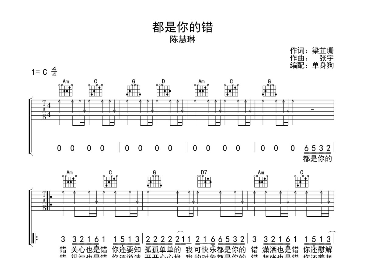 《都是你的错》是陈慧琳演唱的一首歌曲,本吉他谱采用的是C调指法编配,这份吉他谱共有三张高清图谱,图谱由 @单身狗 编配上传,图谱使用六线谱编配,包含吉他和弦指法、简谱以及歌词部分,使用这份都是你的错吉他谱,可以让你更加方便地掌握这首歌曲的弹唱技巧,快来尝试吧。陈慧琳《都是你的错》吉他弹唱谱,采用C调指法编配,单身狗编配出品,共有3张高清图谱。