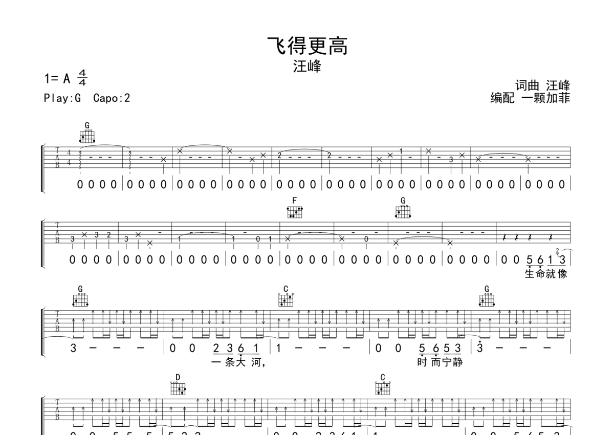 汪峰《飞得更高》吉他谱 - G调弹唱六线谱