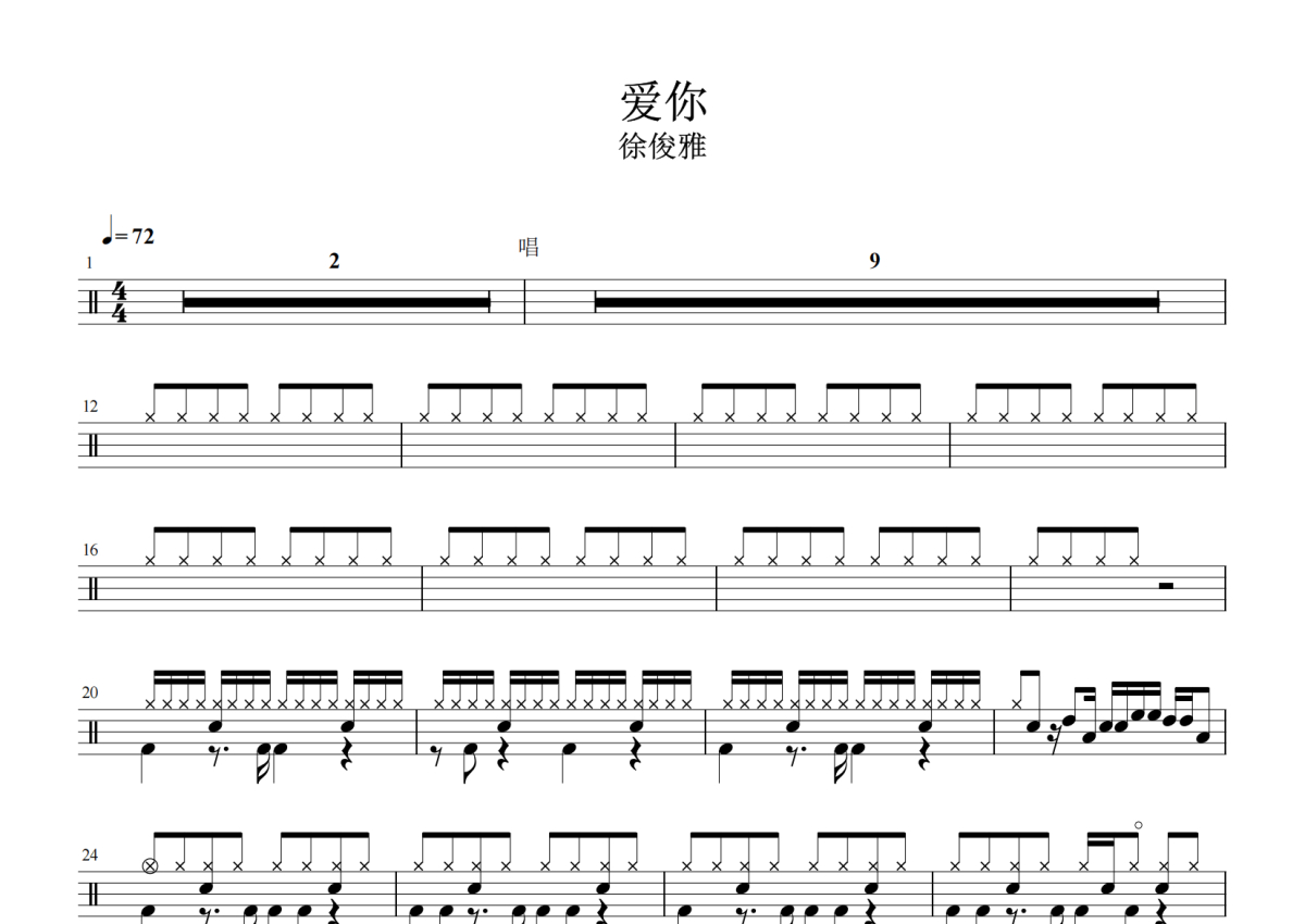 《爱你》是徐俊雅演唱的一首歌曲,这份架子鼓谱共有两张高清图谱,图谱由 @举个例子 编配上传,图谱使用五线谱编配,使用这份爱你架子鼓谱,你将能够轻松地敲打出这首徐俊雅的爱你,快来尝试吧。