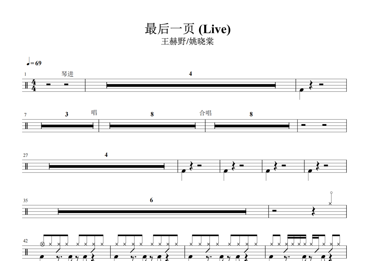 王赫野 姚晓棠《最后一页live》架子鼓谱