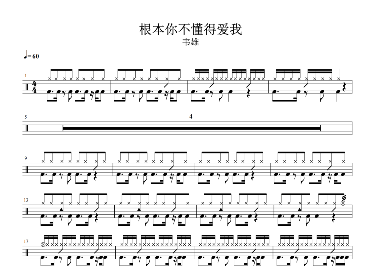 《根本你不懂得爱我》是韦雄演唱的一首歌曲,这份架子鼓谱共有两张高清图谱,图谱由 @16分音符 编配上传,图谱使用五线谱编配,使用这份根本你不懂得爱我架子鼓谱,你将能够轻松地敲打出这首韦雄的根本你不懂得爱我,快来尝试吧。