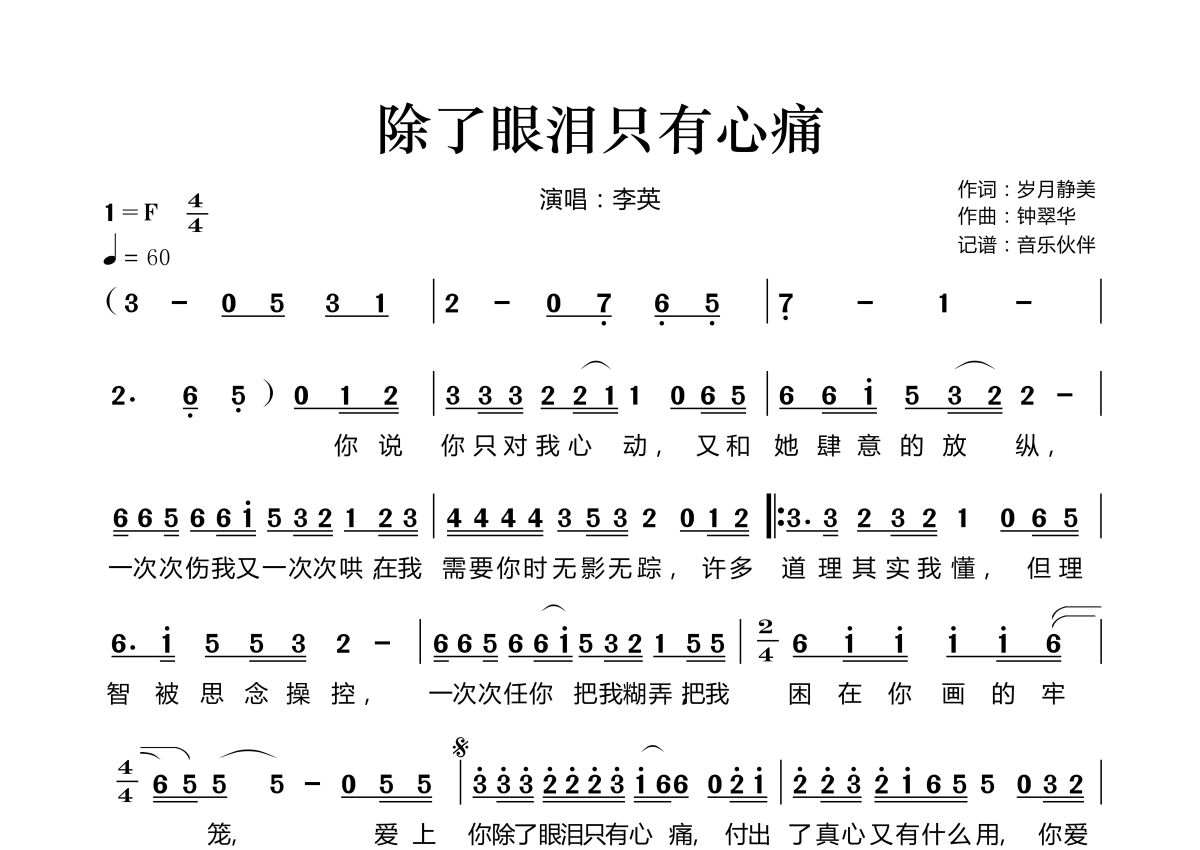 《除了眼泪只有心痛》是李英演唱的一首歌曲,拍号为4/4拍,歌曲速度为每分钟60拍,这份简谱共有一张高清图谱,图谱由 @音乐伙伴 编配上传。