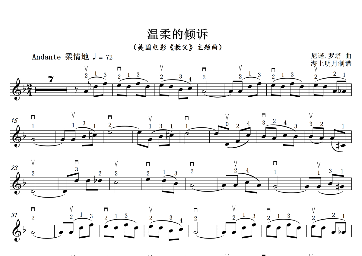 《温柔的倾诉》是教父主题曲演唱的一首歌曲,五线谱+简谱,拍号为2/4拍,这份小提琴谱共有两张高清图谱,图谱由 @海上明月 编配上传。