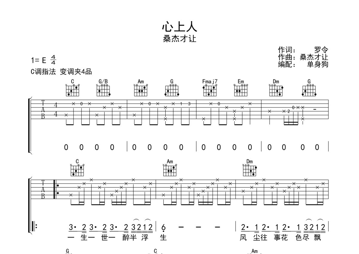 《心上人》是桑杰才让演唱的一首歌曲,本吉他谱采用的是C调指法编配,这份吉他谱共有三张高清图谱,图谱由 @单身狗 编配上传,图谱使用六线谱编配,包含吉他和弦指法、简谱以及歌词部分,使用这份心上人吉他谱,可以让你更加方便地掌握这首歌曲的弹唱技巧,快来尝试吧。桑杰才让《心上人》吉他弹唱谱,采用C调指法编配,单身狗编配出品,共有3张高清图谱。