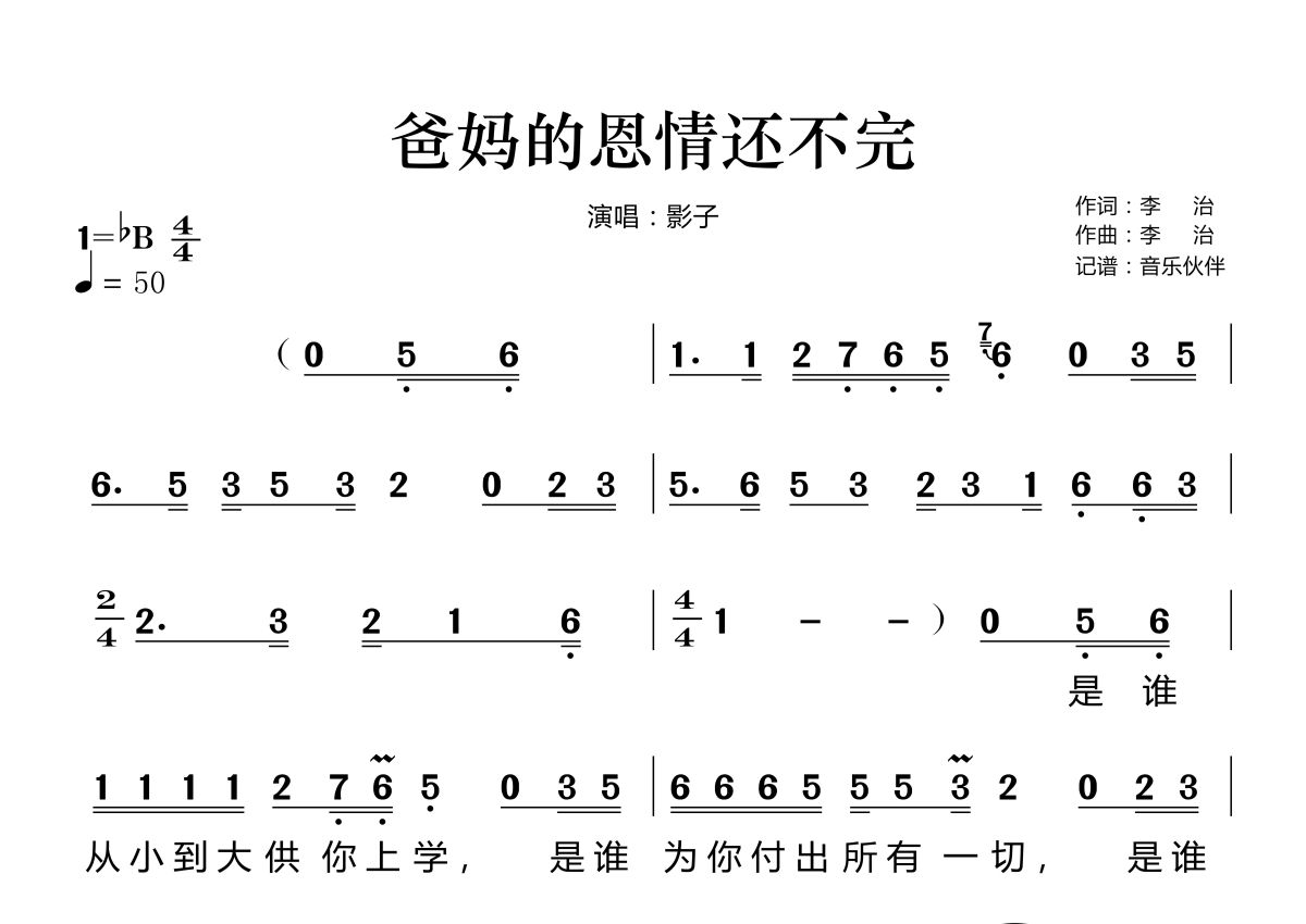 爸妈的恩情还不完简谱 - 影子演唱