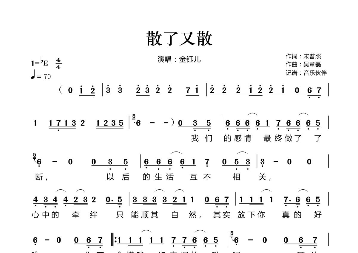 散了又散简谱 - 金钰儿演唱