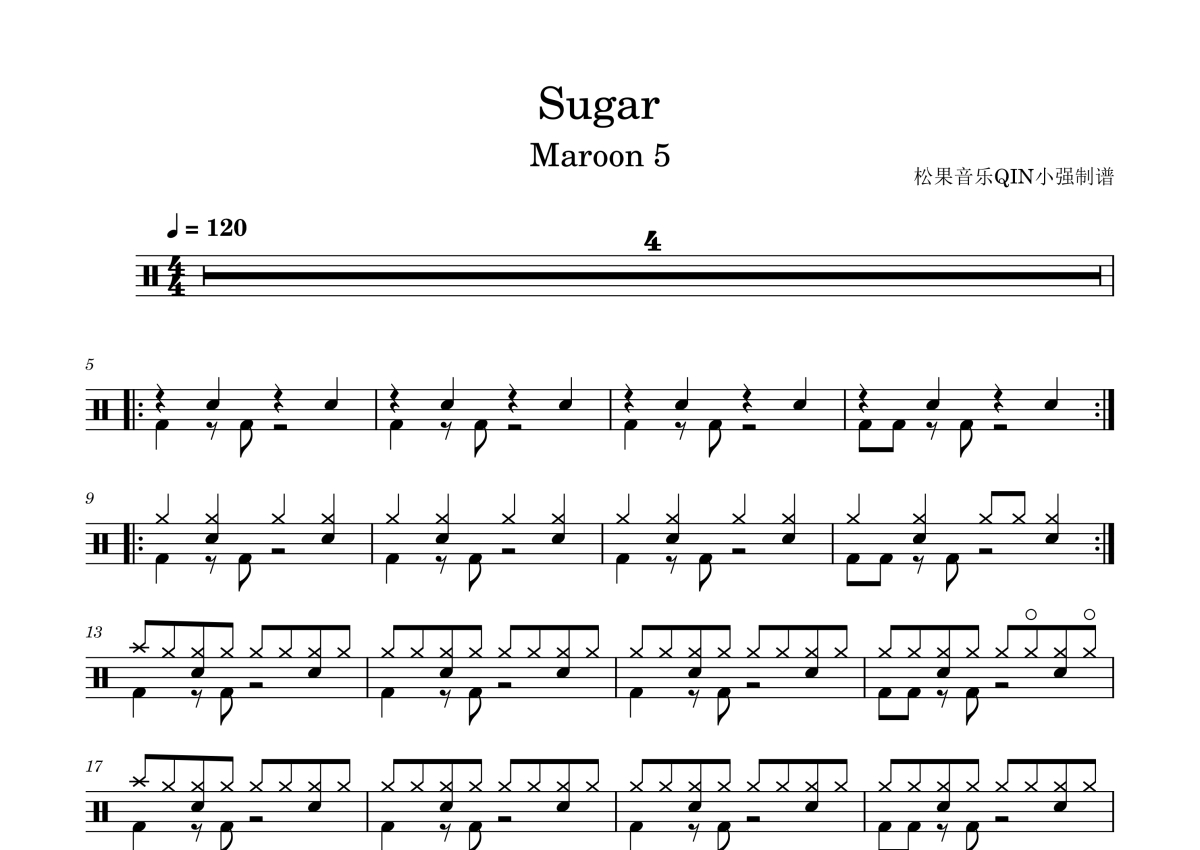 《Sugar》是魔力红演唱的一首歌曲,拍号为4/4拍,这份架子鼓谱共有三张高清图谱,图谱由 @松果音乐QIN小强 编配上传,图谱使用五线谱编配,使用这份Sugar架子鼓谱,你将能够轻松地敲打出这首魔力红的Sugar,快来尝试吧。《Sugar》是美国摇滚乐队魔力红演唱的一首流行歌曲,歌词及曲谱由亚当·莱文、亨利·沃尔特、雅各布·凯瑟·海德伦、约书亚·科尔曼、Dr. Luke和迈克·波斯纳等人创作,于2015年1月13日作为其第五张录音室专辑《V》的第三支单曲发行。2015年3月10日,推出与说唱歌手妮琪·米娜合作的混音版。