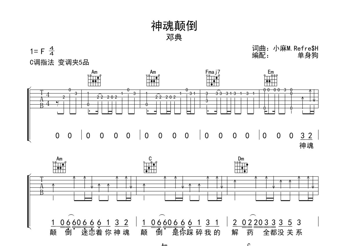 《神魂颠倒》是邓典演唱的一首歌曲,本吉他谱采用的是C调指法编配,这份吉他谱共有三张高清图谱,图谱由 @单身狗 编配上传,图谱使用六线谱编配,包含吉他和弦指法、简谱以及歌词部分,使用这份神魂颠倒吉他谱,可以让你更加方便地掌握这首歌曲的弹唱技巧,快来尝试吧。邓典《神魂颠倒》吉他弹唱谱,采用C调指法编配,单身狗编配出品,共有3张高清图谱。