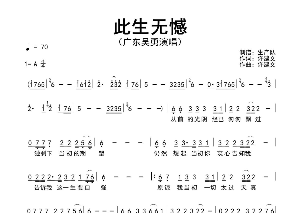 广东吴勇《此生无憾》简谱 - 原版简谱