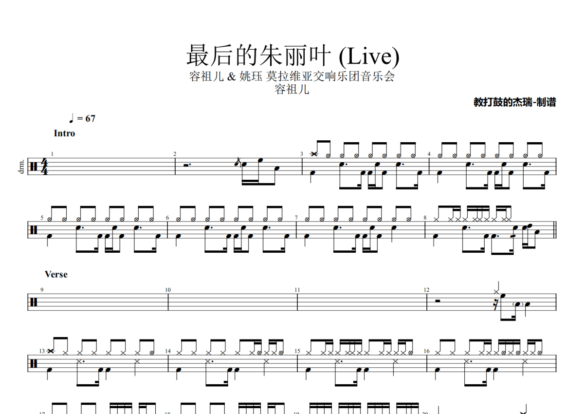 《最后的朱丽叶 (Live)》是容祖儿演唱的一首歌曲,容祖儿 & 姚珏 莫拉维亚交响乐团音乐会,拍号为4/4拍,歌曲速度为每分钟67拍,这份架子鼓谱共有两张高清图谱,图谱由 @Jerry 编配上传,图谱使用五线谱编配,使用这份最后的朱丽叶 (Live)架子鼓谱,你将能够轻松地敲打出这首容祖儿的最后的朱丽叶 (Live),快来尝试吧。