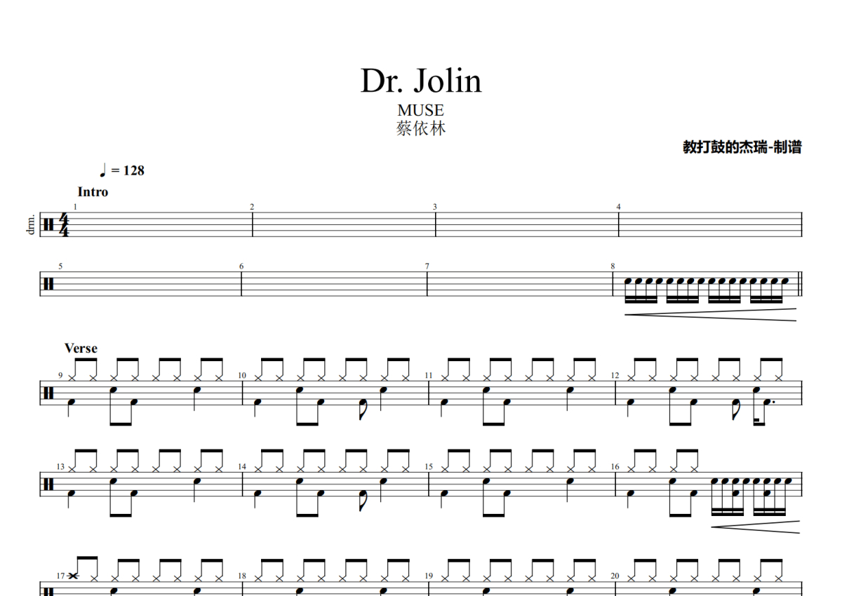 《Dr. Jolin》是蔡依林演唱的一首歌曲,拍号为4/4拍,歌曲速度为每分钟128拍,这份架子鼓谱共有三张高清图谱,图谱由 @Jerry 编配上传,图谱使用五线谱编配,使用这份Dr. Jolin架子鼓谱,你将能够轻松地敲打出这首蔡依林的Dr. Jolin,快来尝试吧。