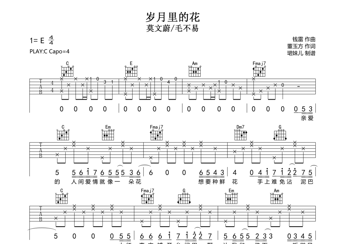 《岁月里的花》是莫文蔚/毛不易演唱的一首歌曲,拍号为4/4拍,歌曲速度为每分钟85拍,歌曲原调为E调,但由于原调指法比较难,为了方便弹奏,本吉他谱采用的是C调指法编配,变调夹4品弹奏即为原调,当然也可以根据自己的音域改变变调夹位置,或者通过改变和弦调性,以方便自己弹奏,这份吉他谱共有两张高清图谱,图谱由 @珺妹儿 编配上传,图谱使用六线谱编配,包含吉他和弦指法、简谱以及歌词部分,使用这份岁月里的花吉他谱,可以让你更加方便地掌握这首歌曲的弹唱技巧,快来尝试吧。